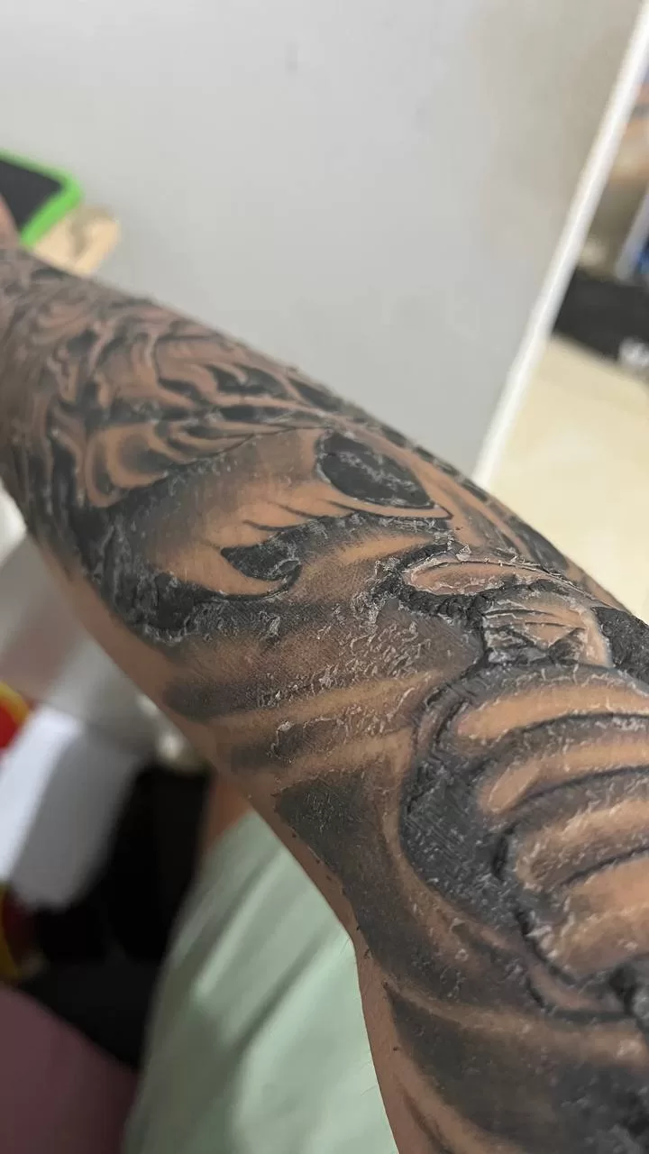 Light scabbing and peeling will begin. The tattoo may appear dull or flaky. Do not pick at scabs – let them fall naturally. Continue gentle washing and moisturizing.